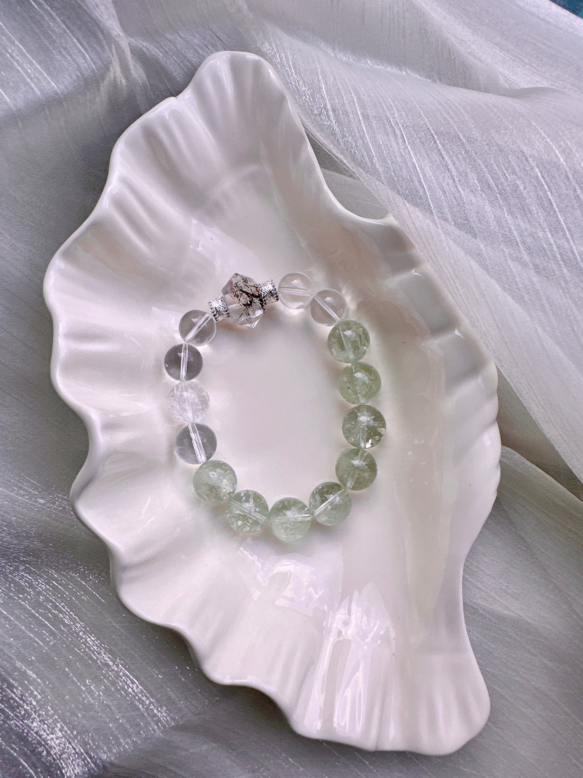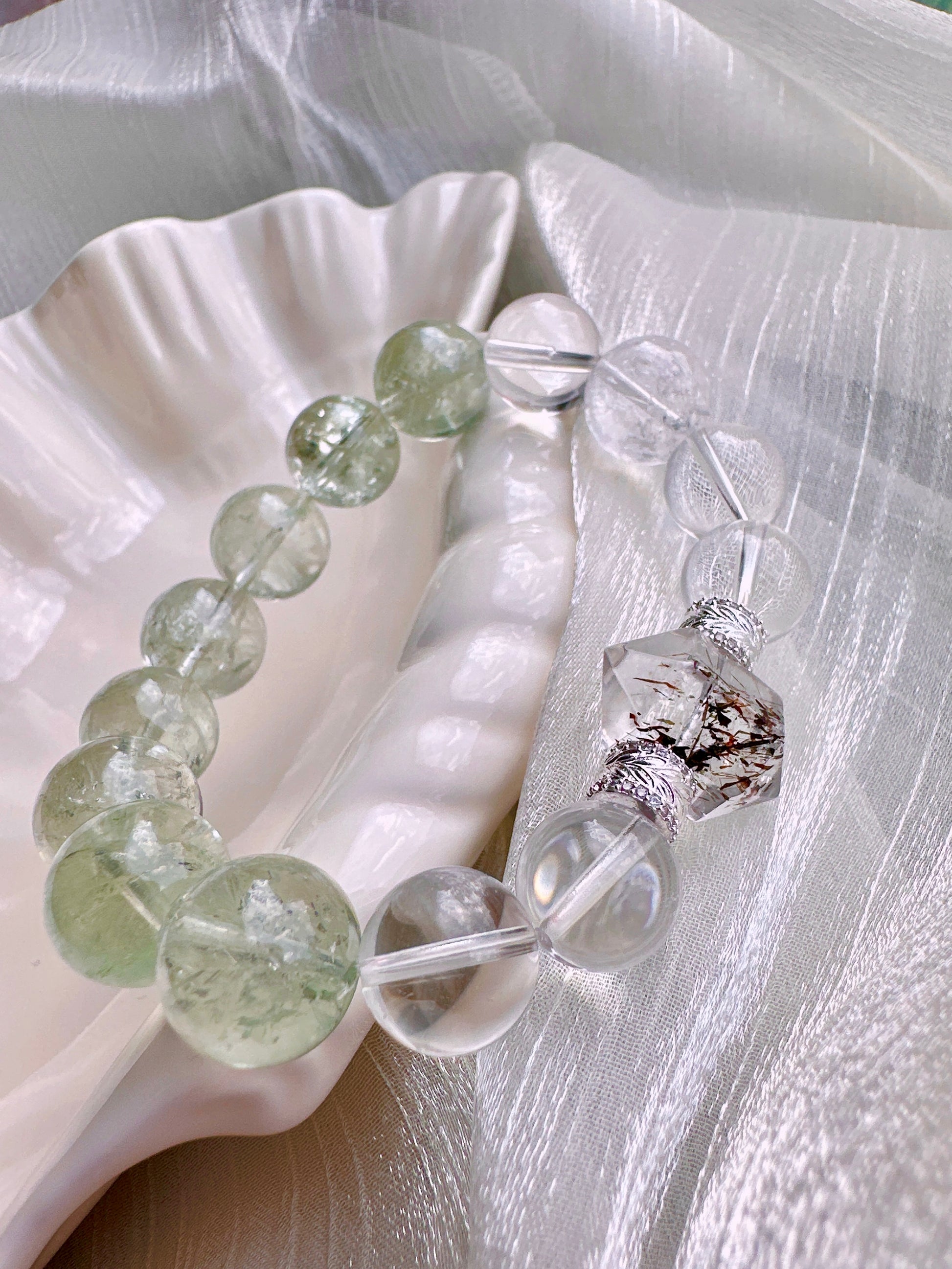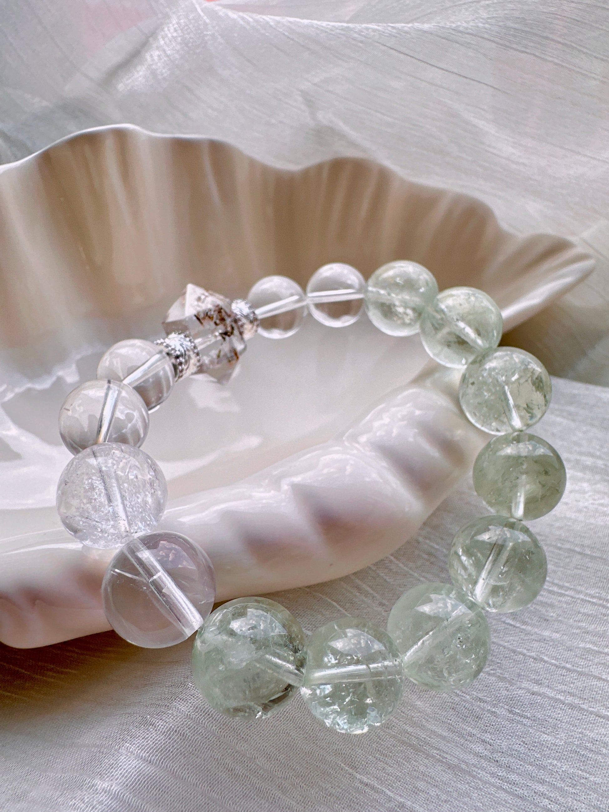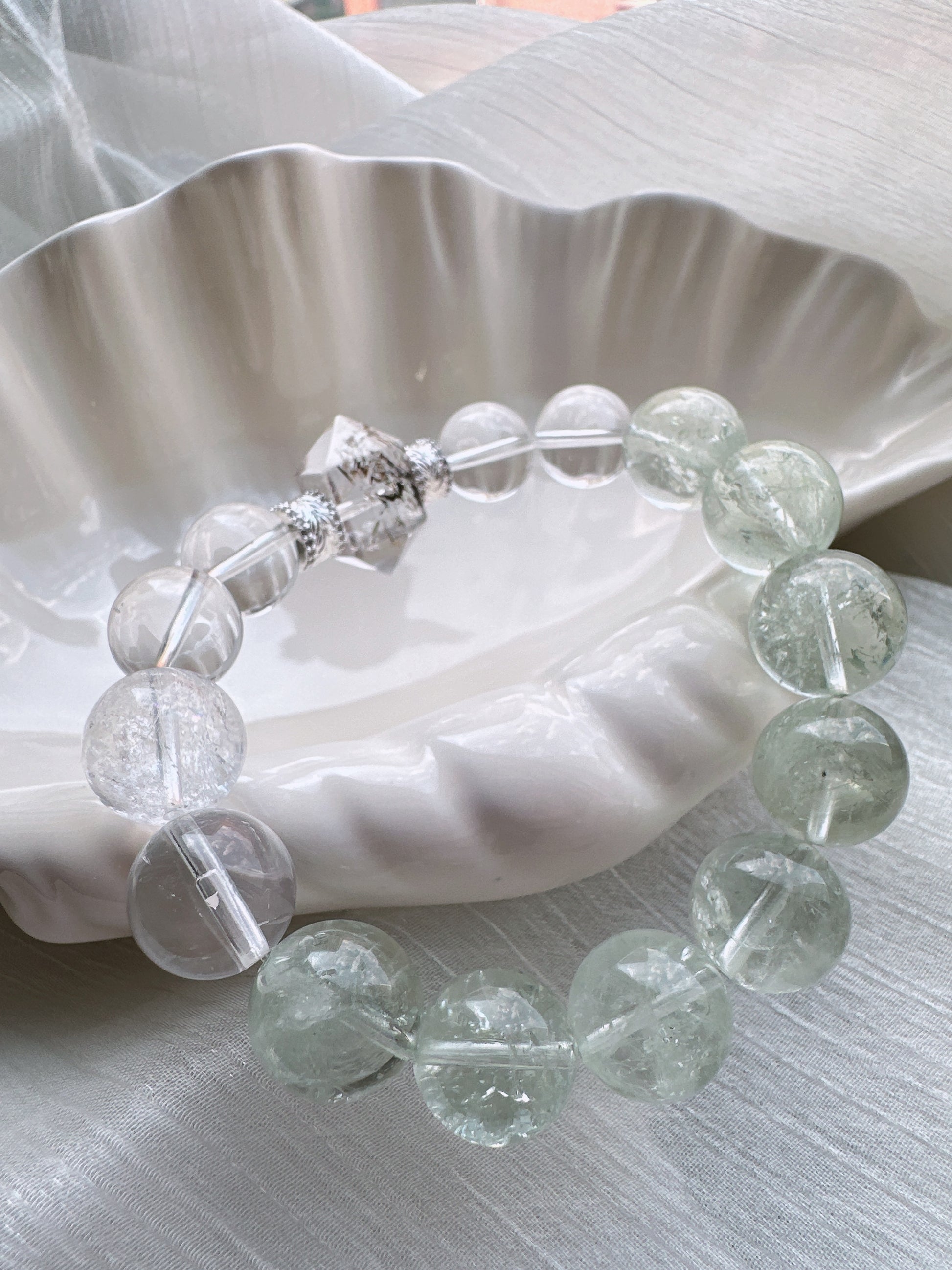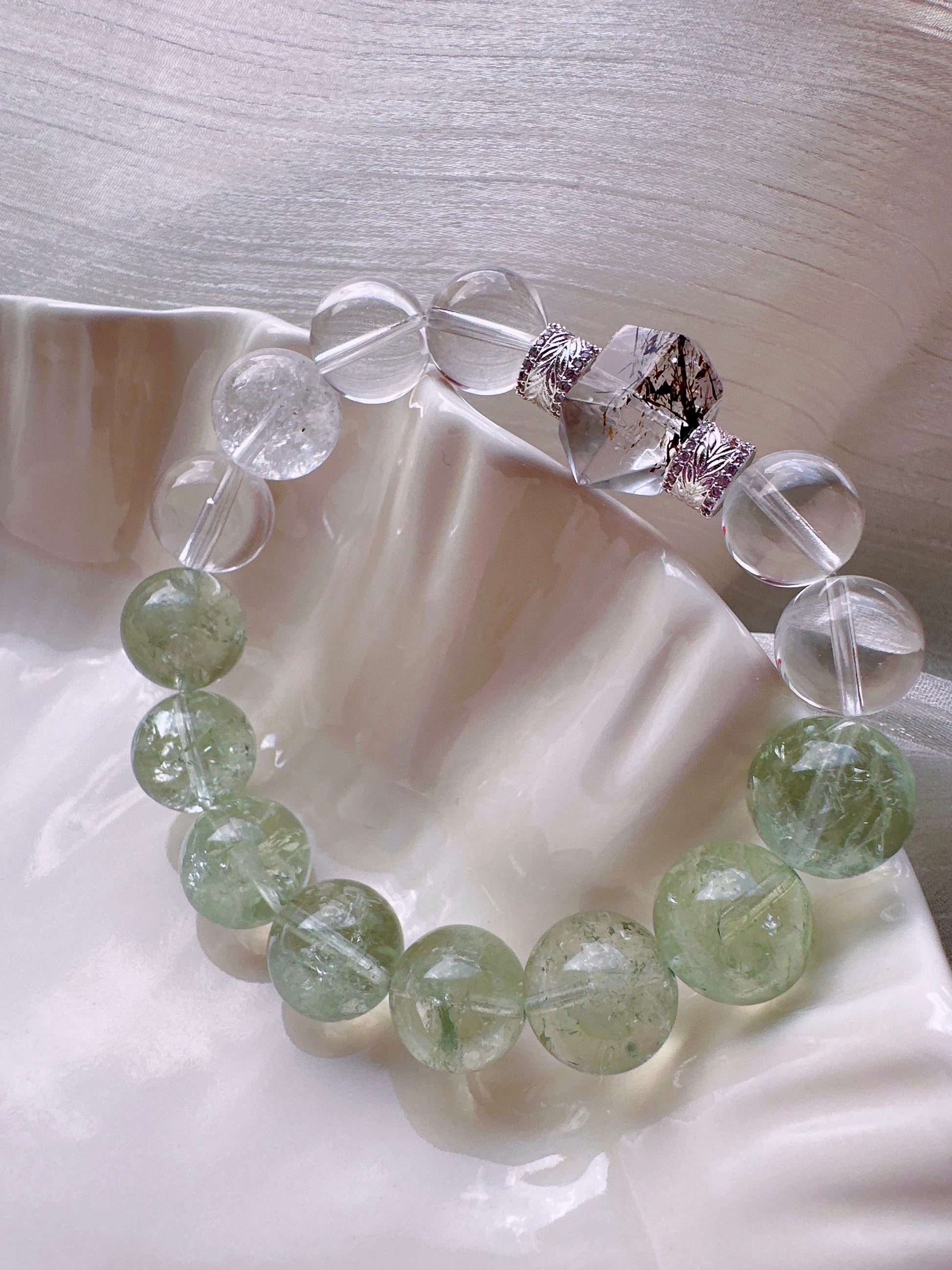 A crystal bracelet featuring a Black Rutilated Quartz double-terminated centerpiece, paired with light green Green Assay Quartz, Clear Quartz, and Himalayan Rainbow Clear Quartz, blending protective energy with clarity and balance—perfect for inner strength and emotional stability, shimmering with an aurora-like mystical glow.