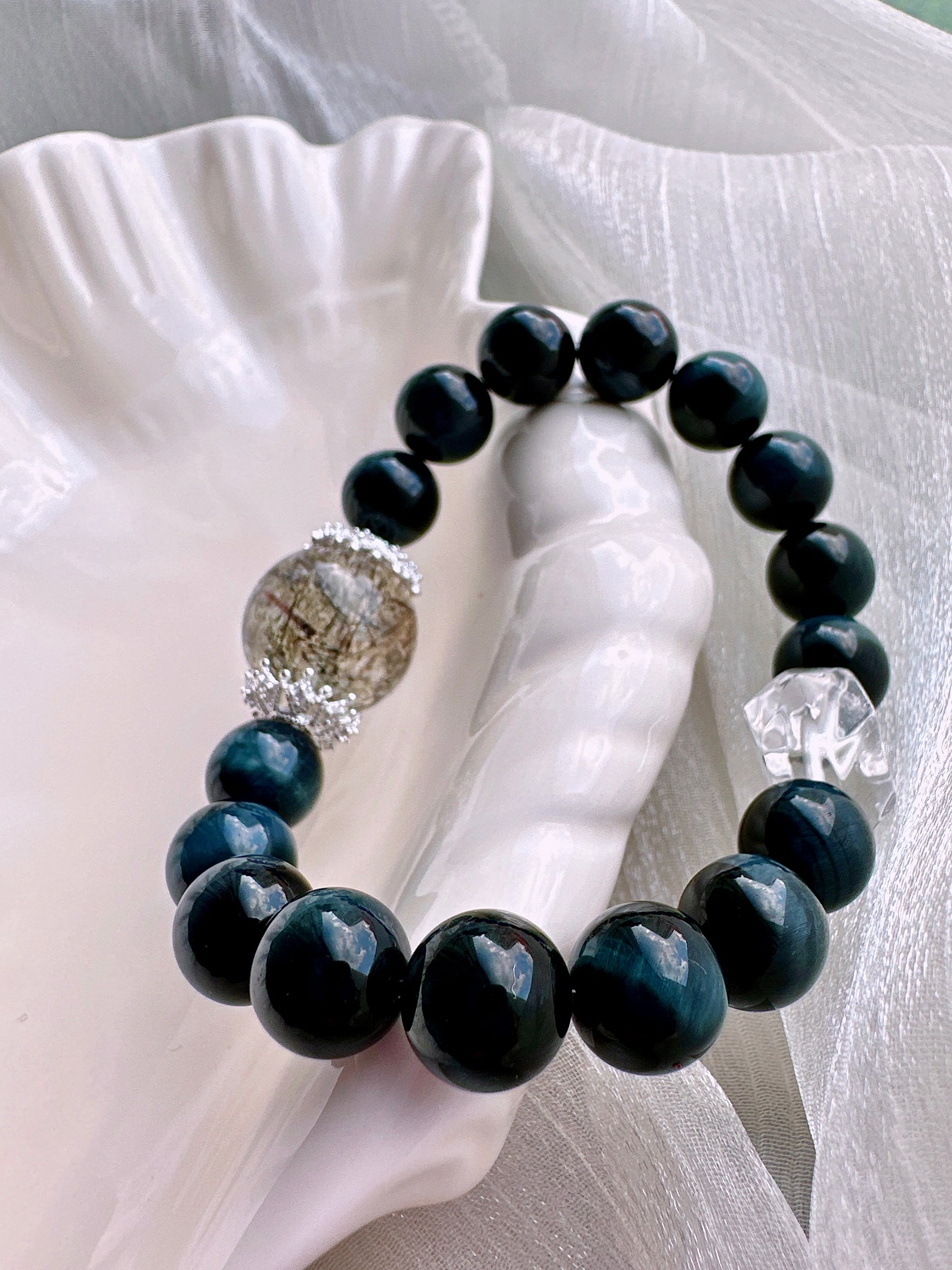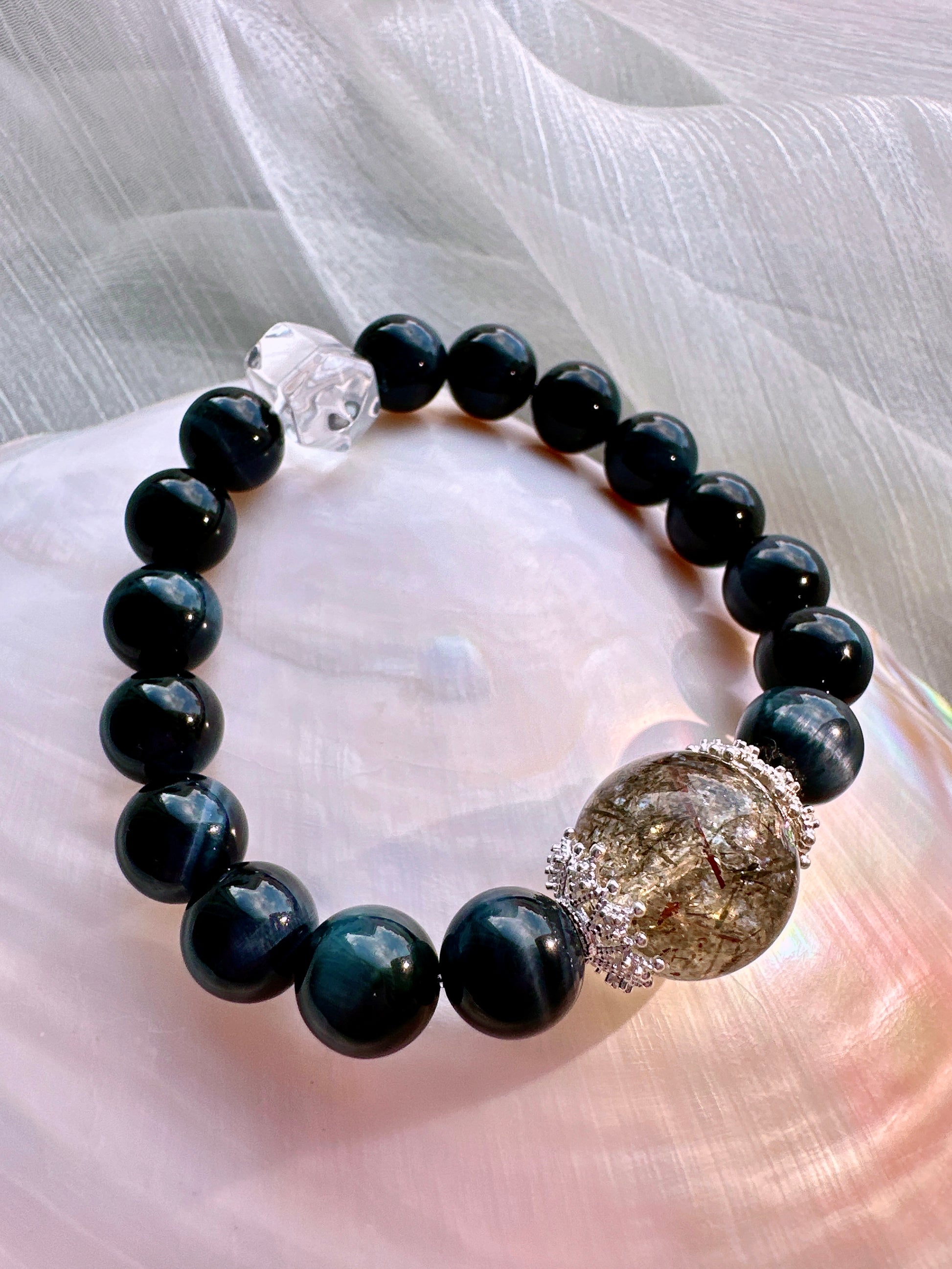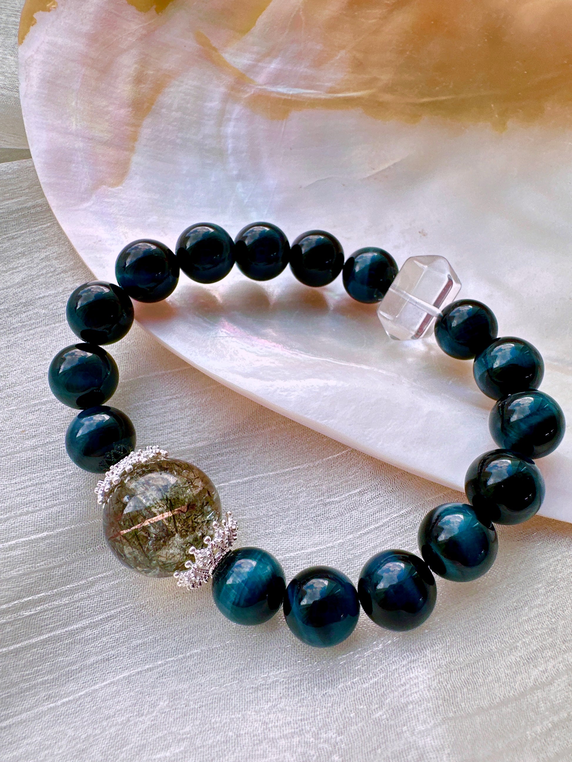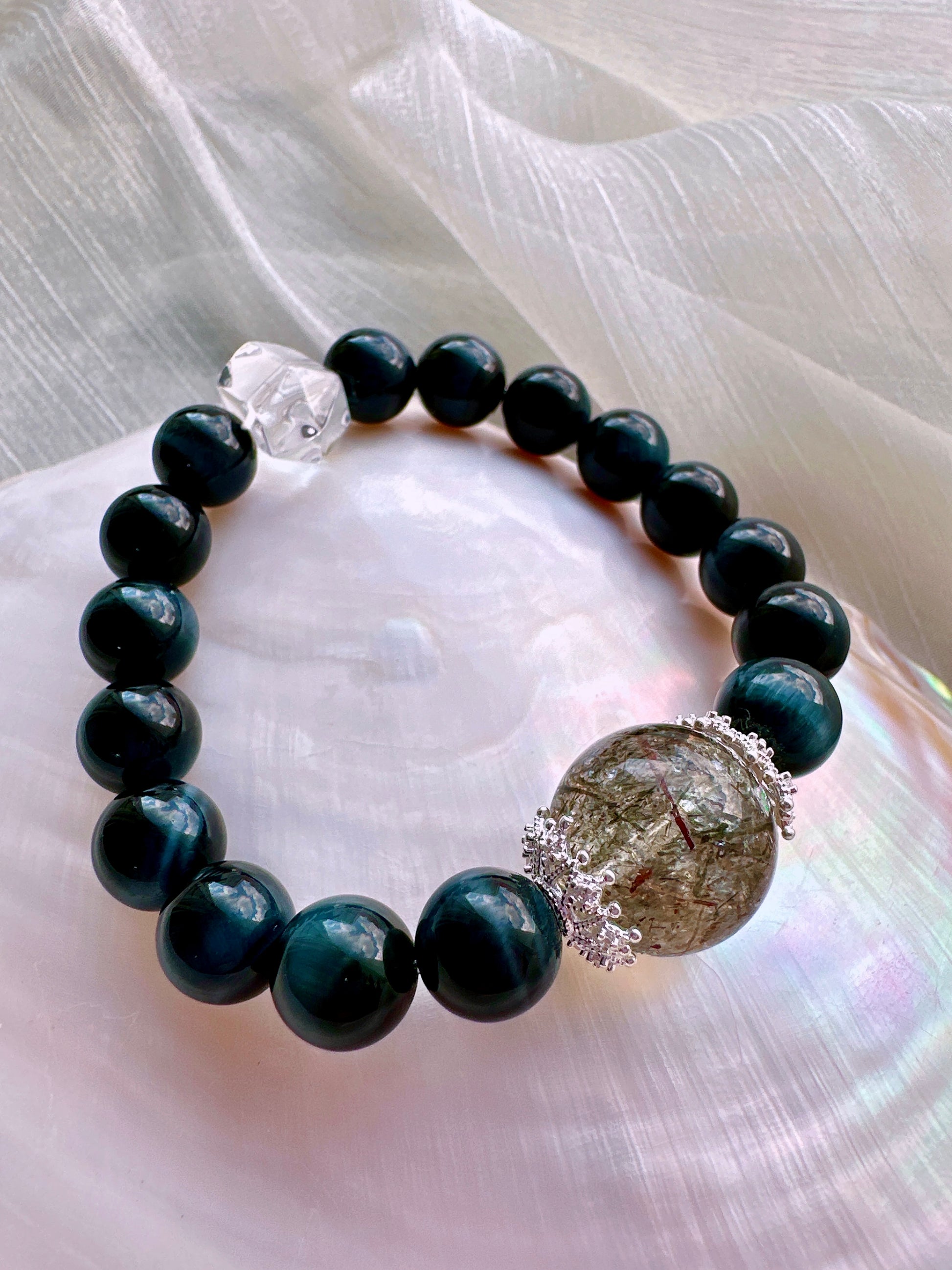A bracelet that carries the mystery of the night and the strength of inner protection. Featuring a Black Gold Super Crystal as the main stone, paired with a Double-Terminated Clear Quartz and Blue Tiger's Eye, this piece blends grounding power, clarity, and calm focus—your talisman for strength and serenity.
