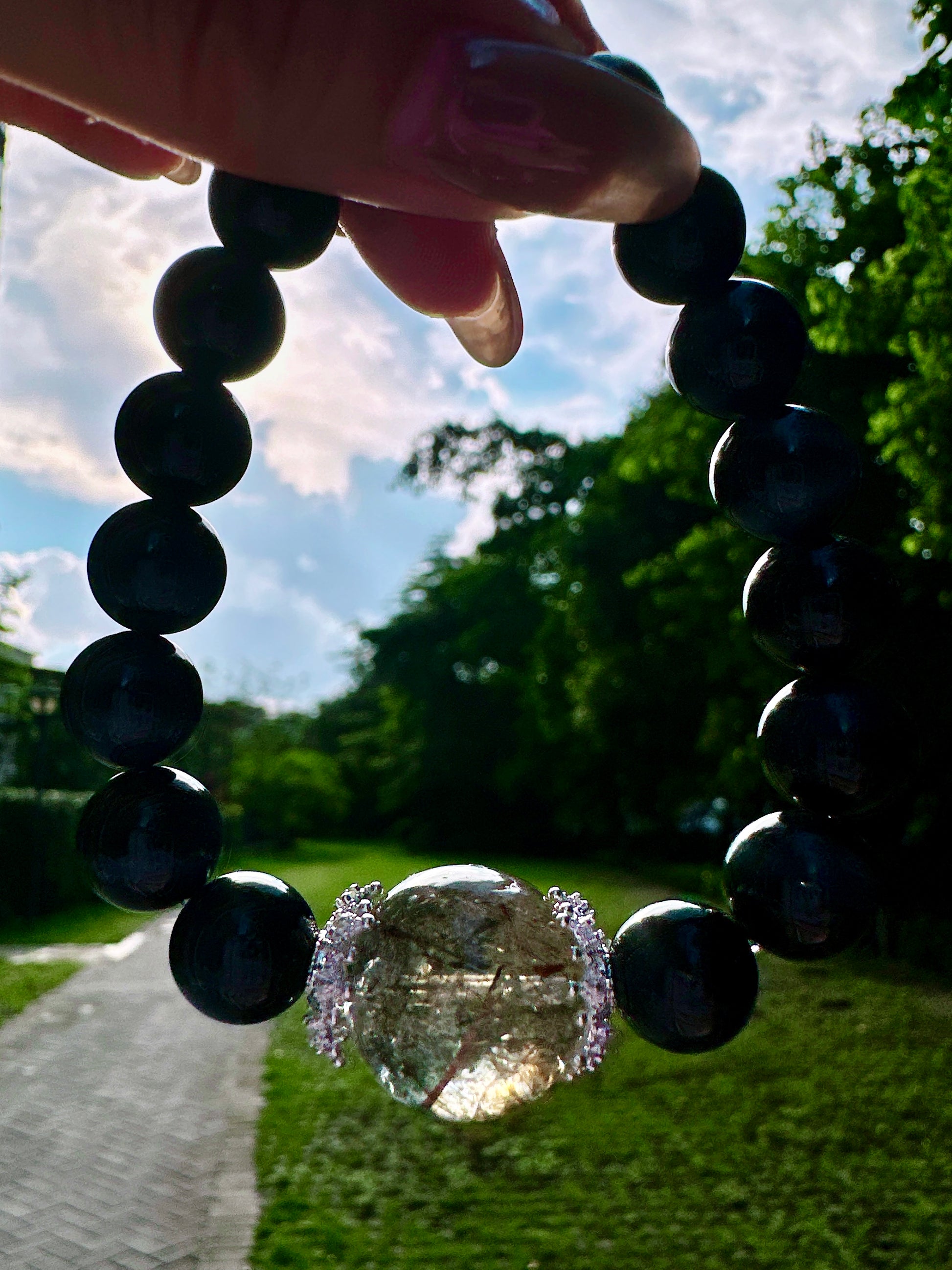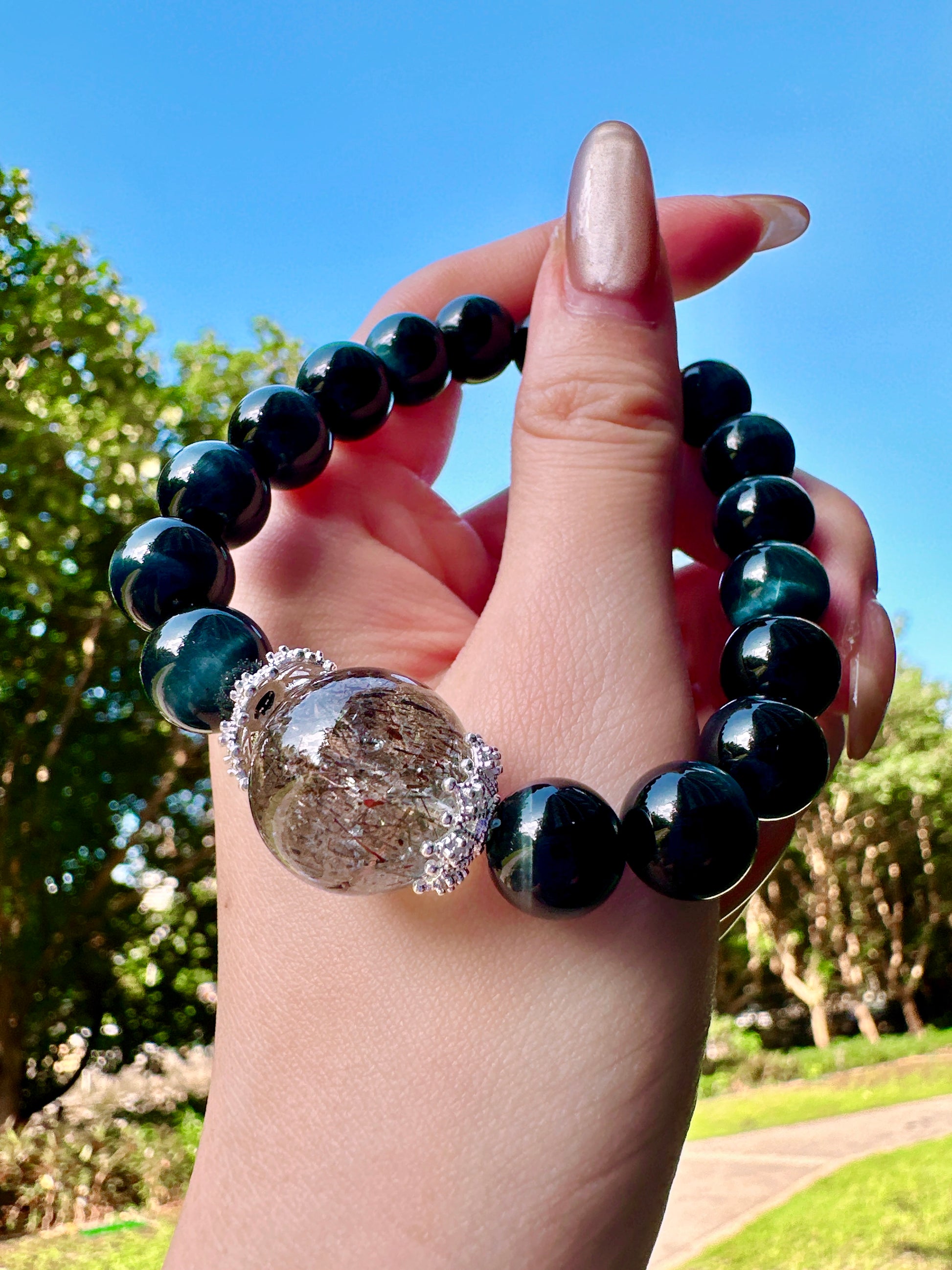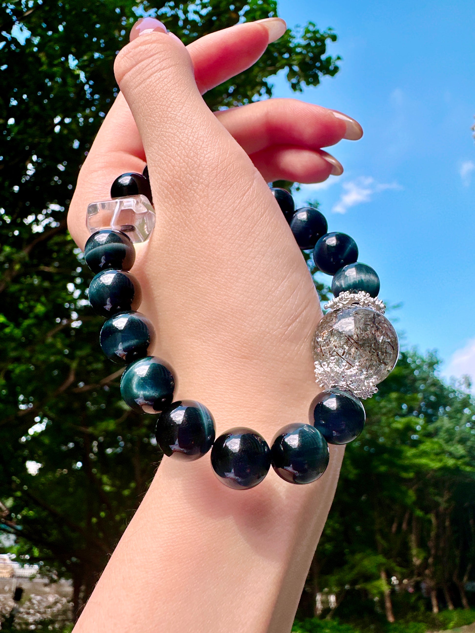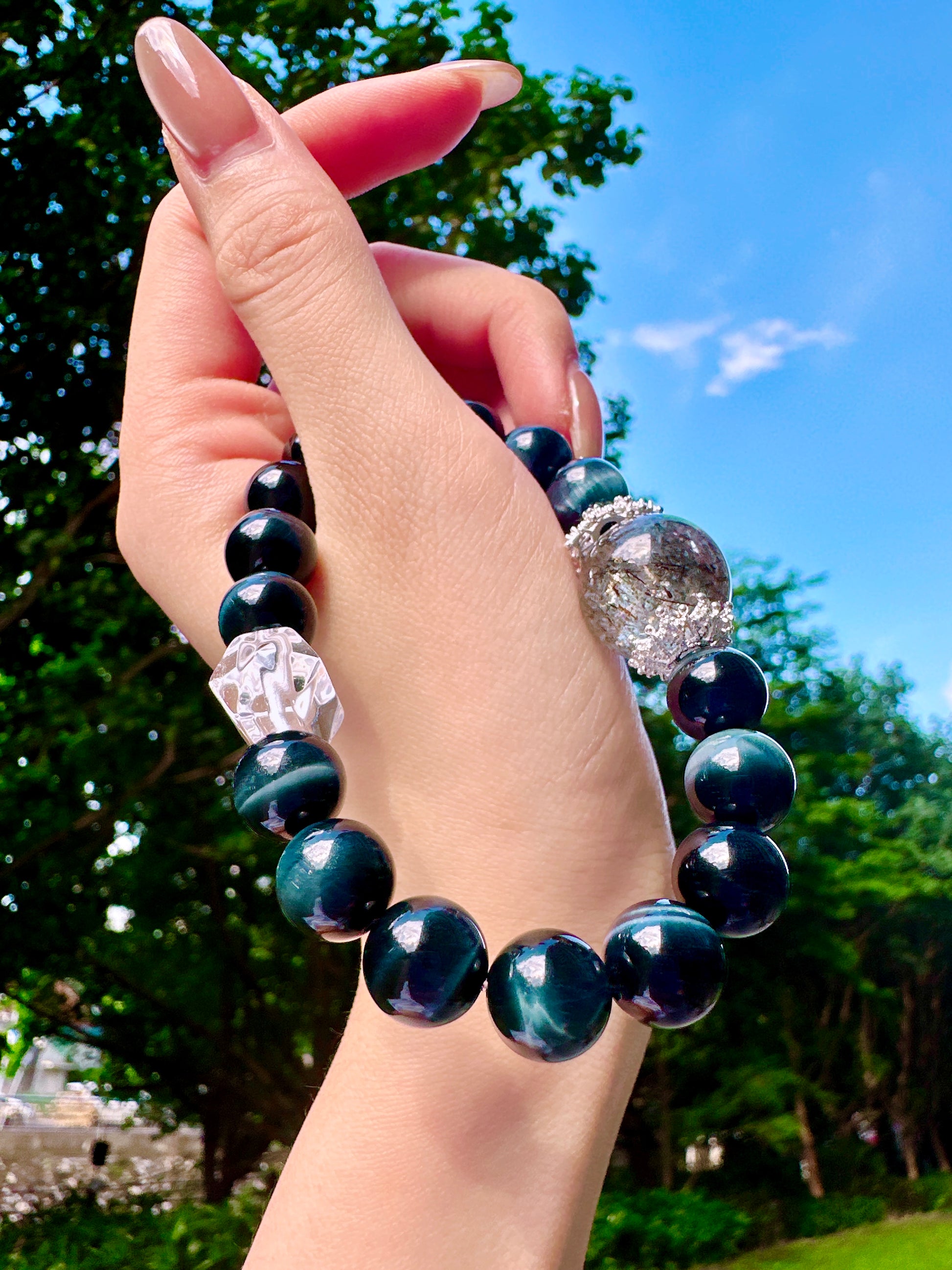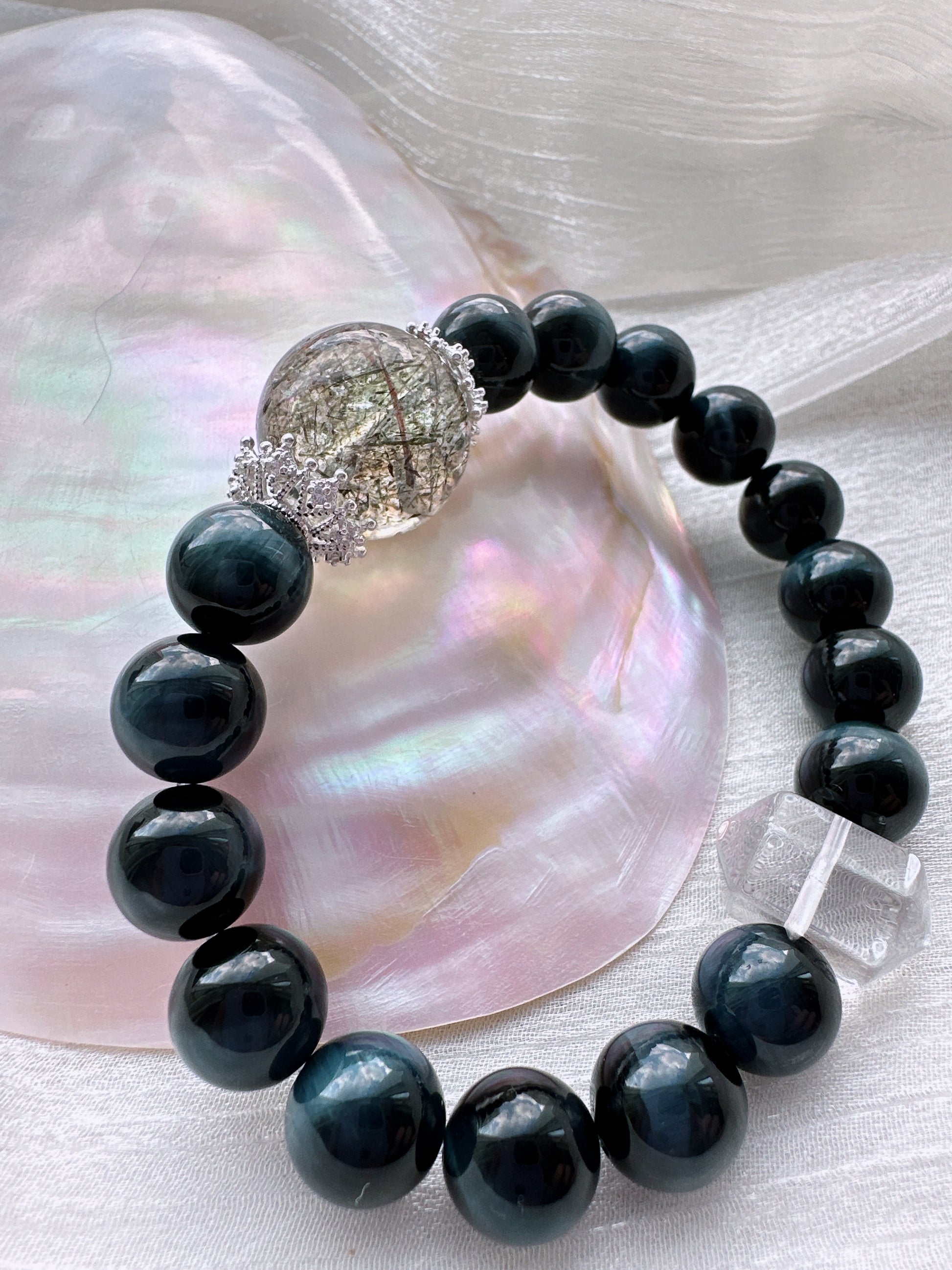 A bracelet that carries the mystery of the night and the strength of inner protection. Featuring a Black Gold Super Crystal as the main stone, paired with a Double-Terminated Clear Quartz and Blue Tiger's Eye, this piece blends grounding power, clarity, and calm focus—your talisman for strength and serenity.