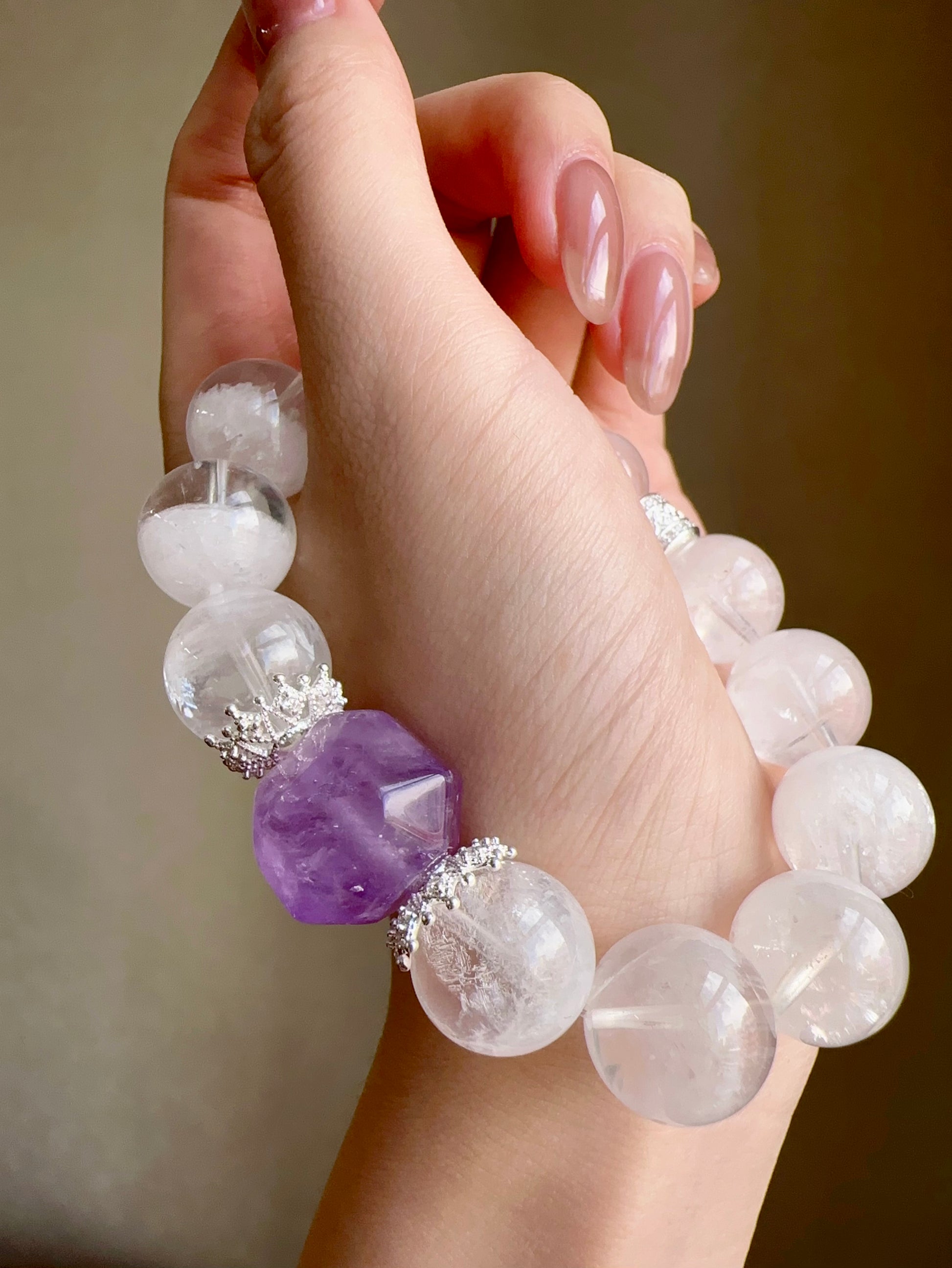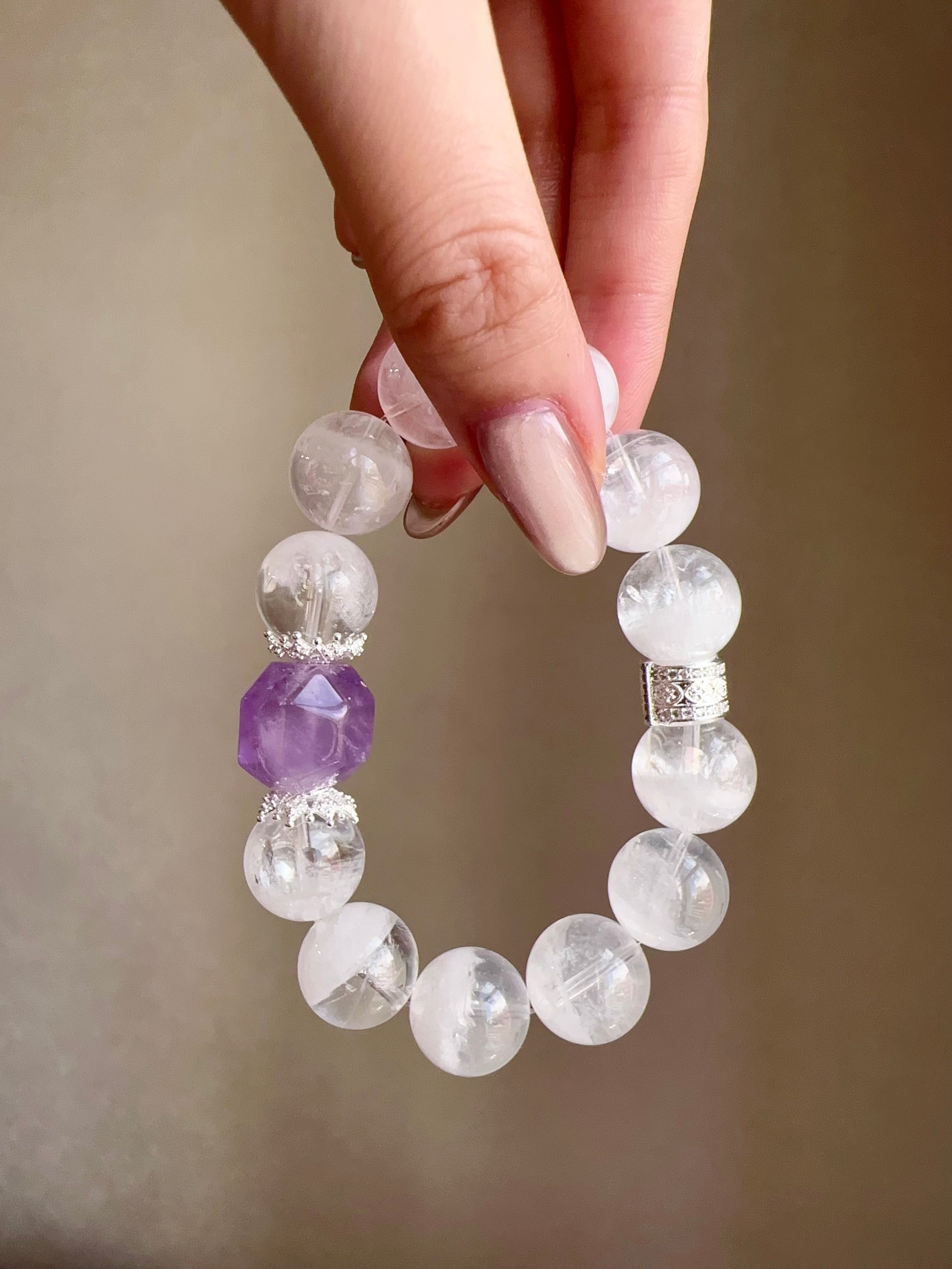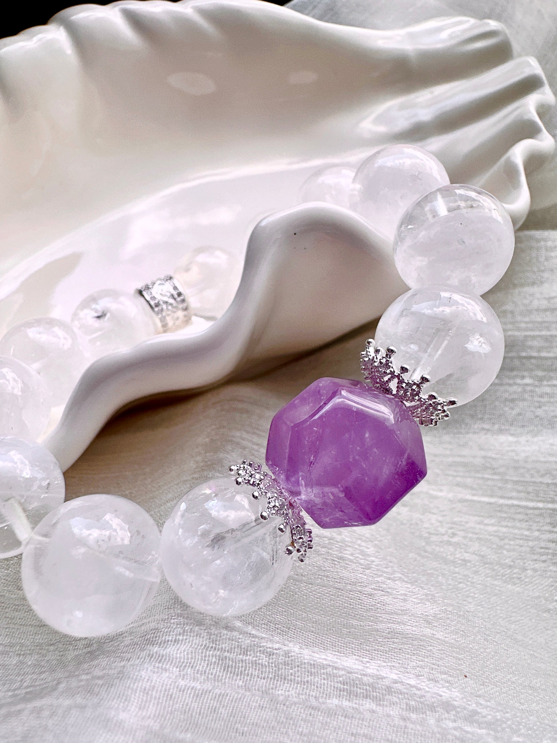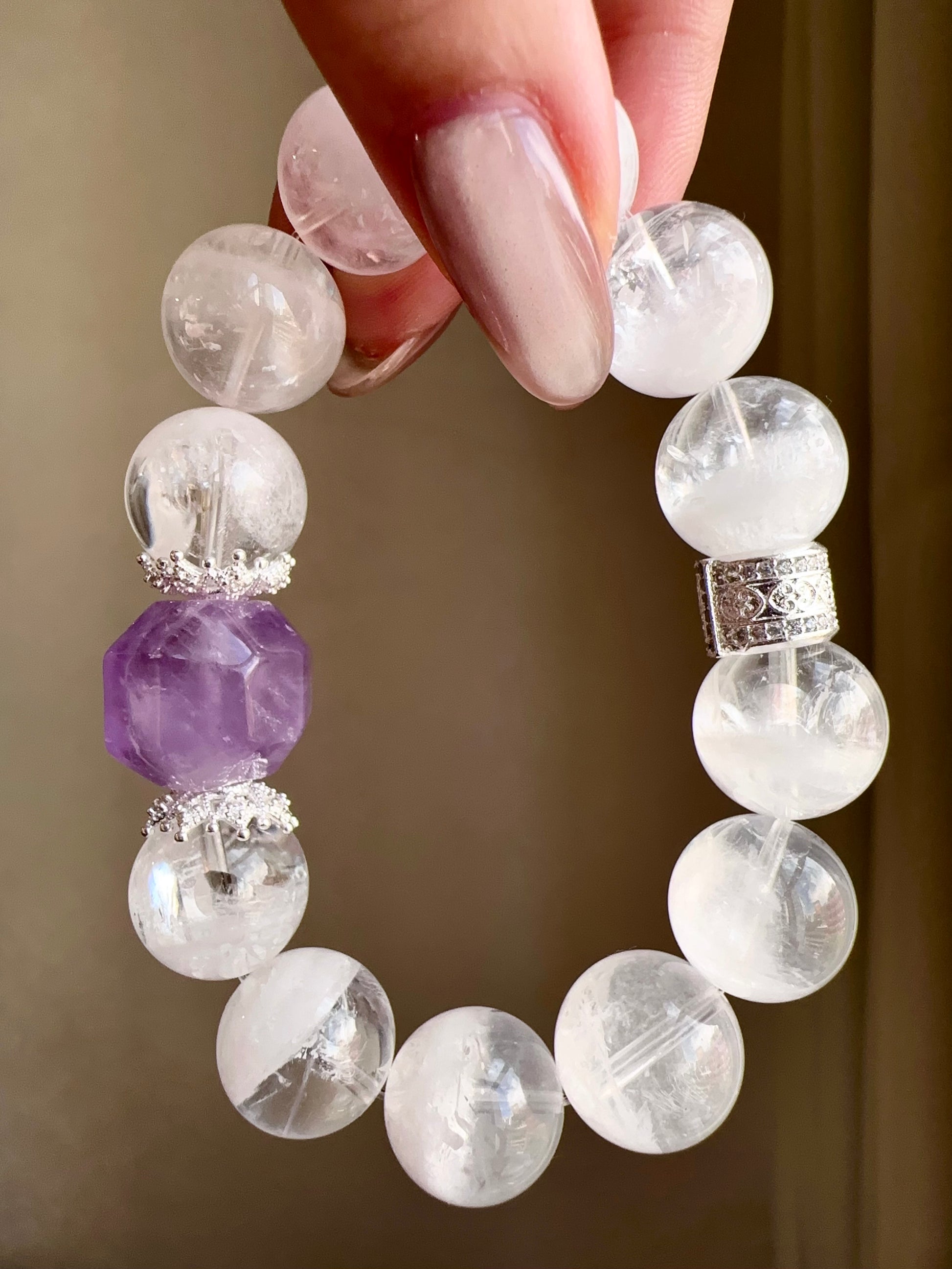 A bracelet that holds the mystery of twilight and the purity of inner stillness. Made with a faceted Amethyst (Water/Fire) centerpiece, surrounded by 12 Phantom Quartz (Metal/Earth) — blending intuition and clarity, grounding and five-element harmony.
