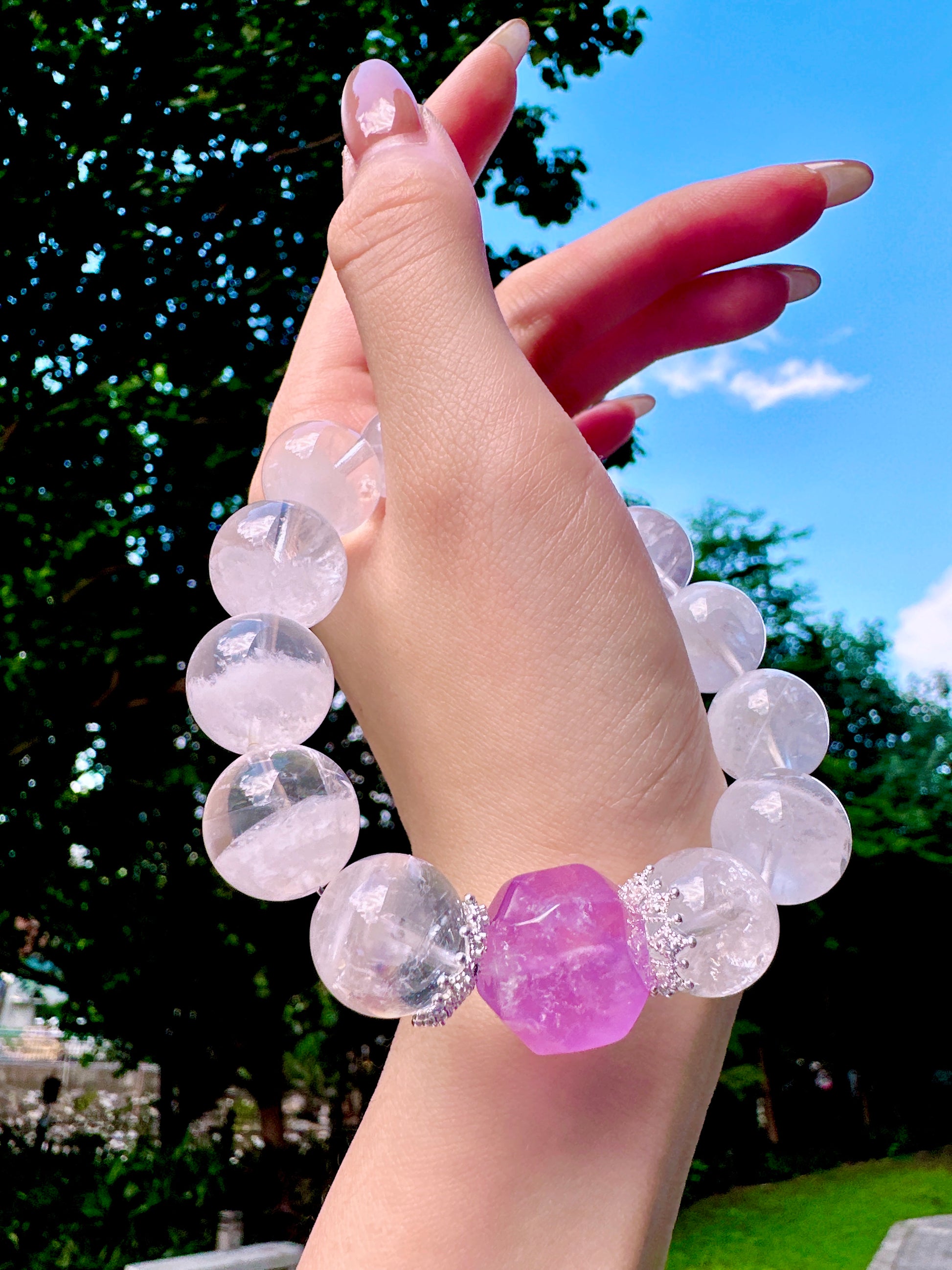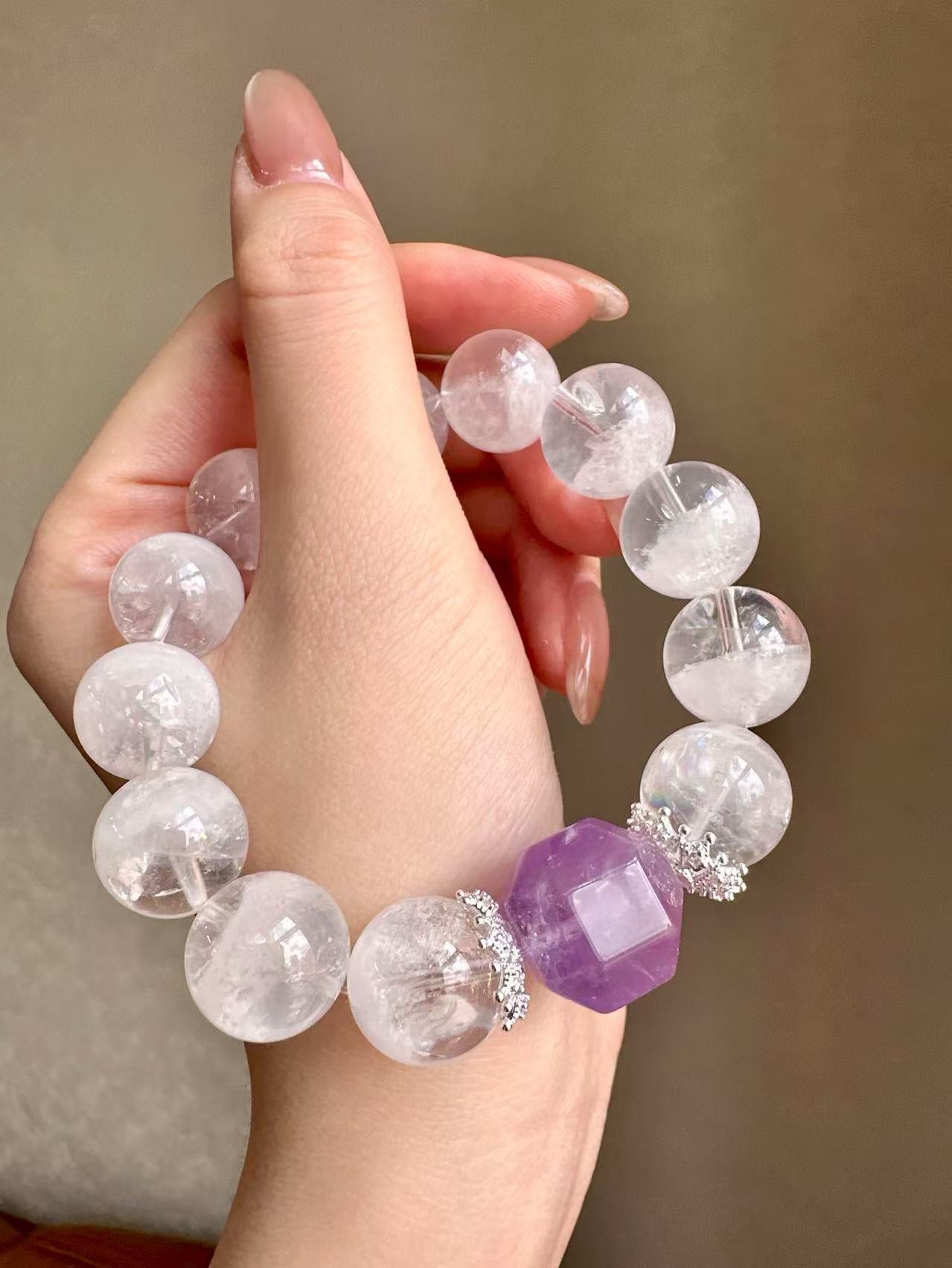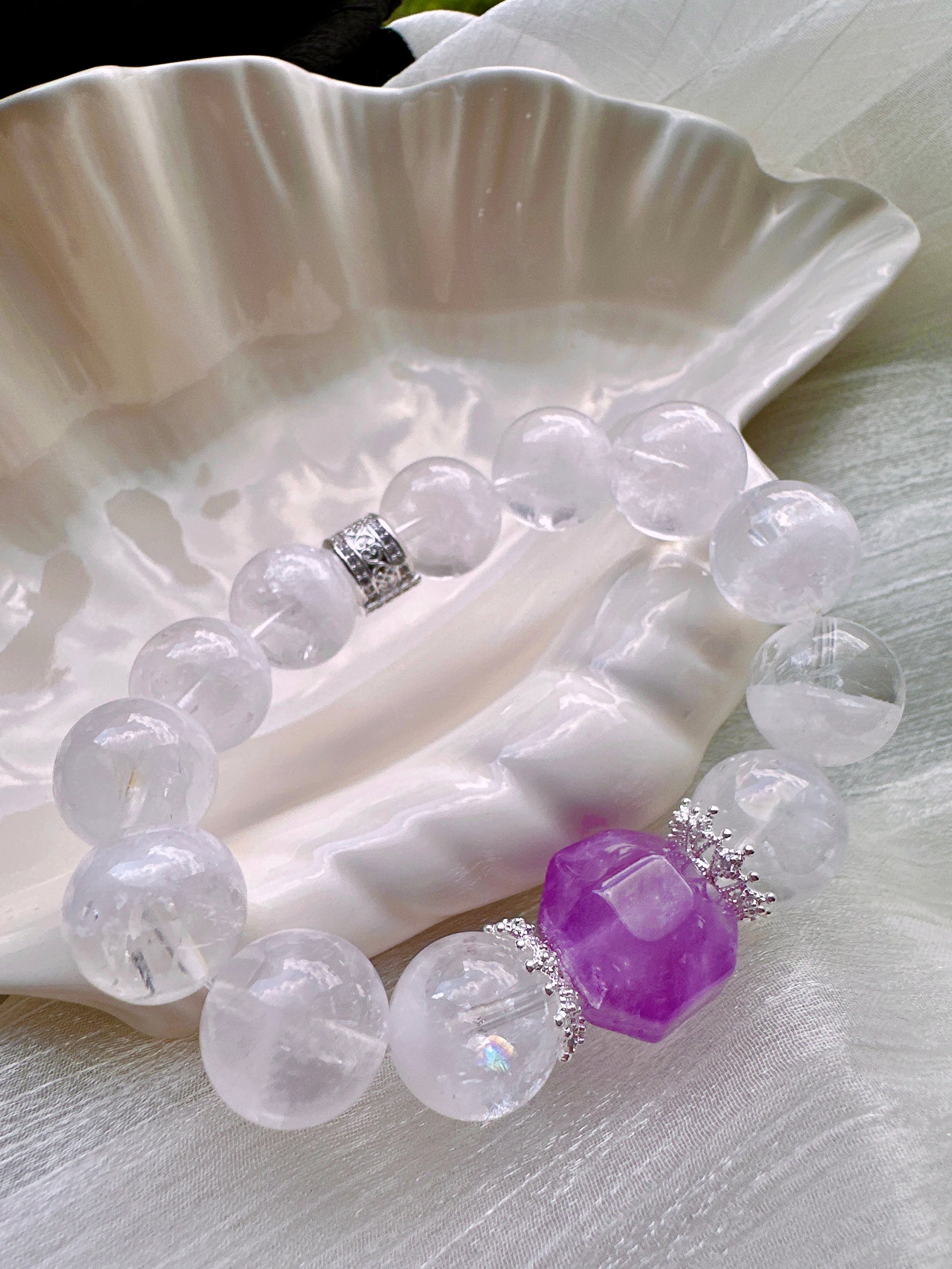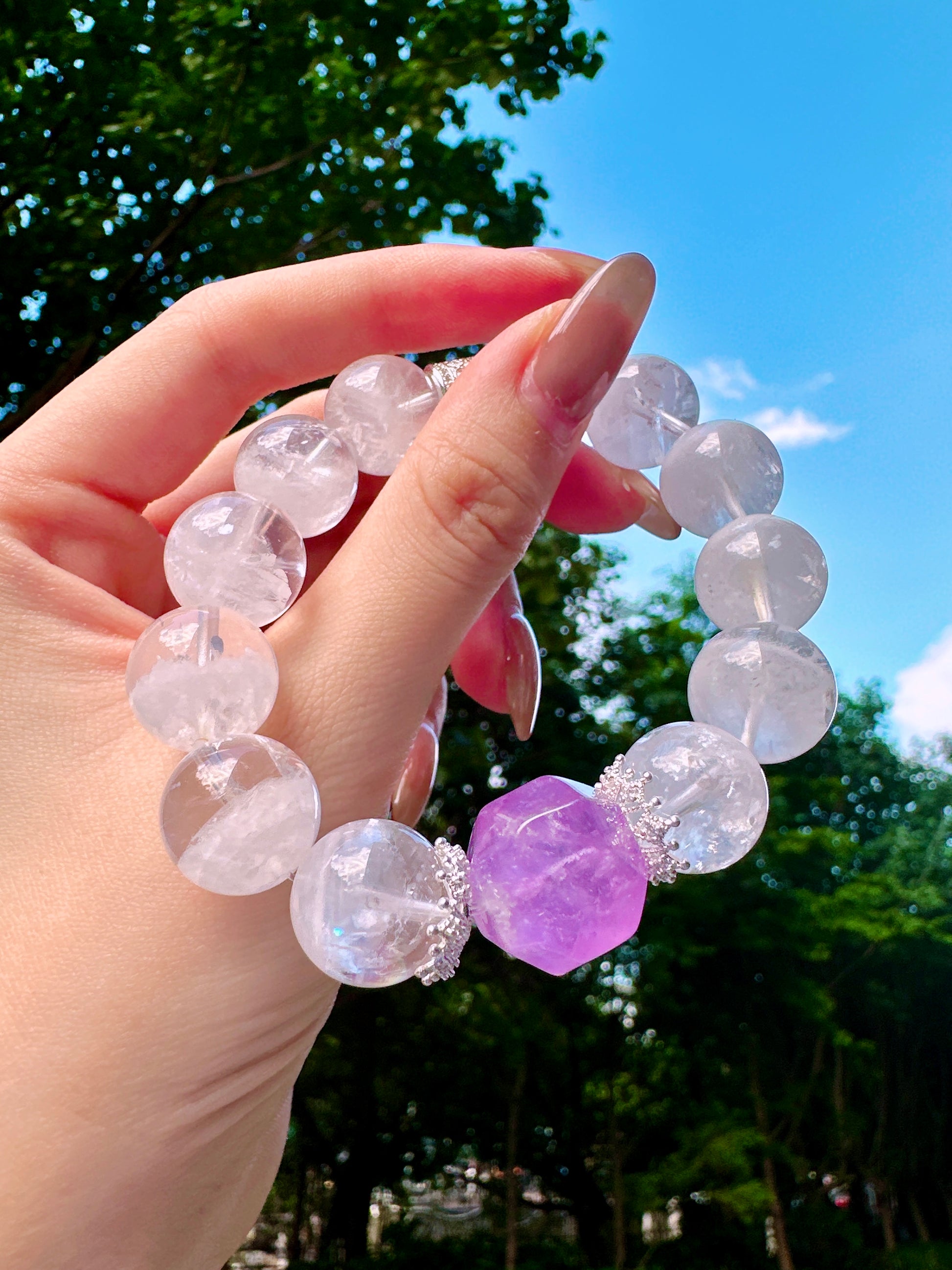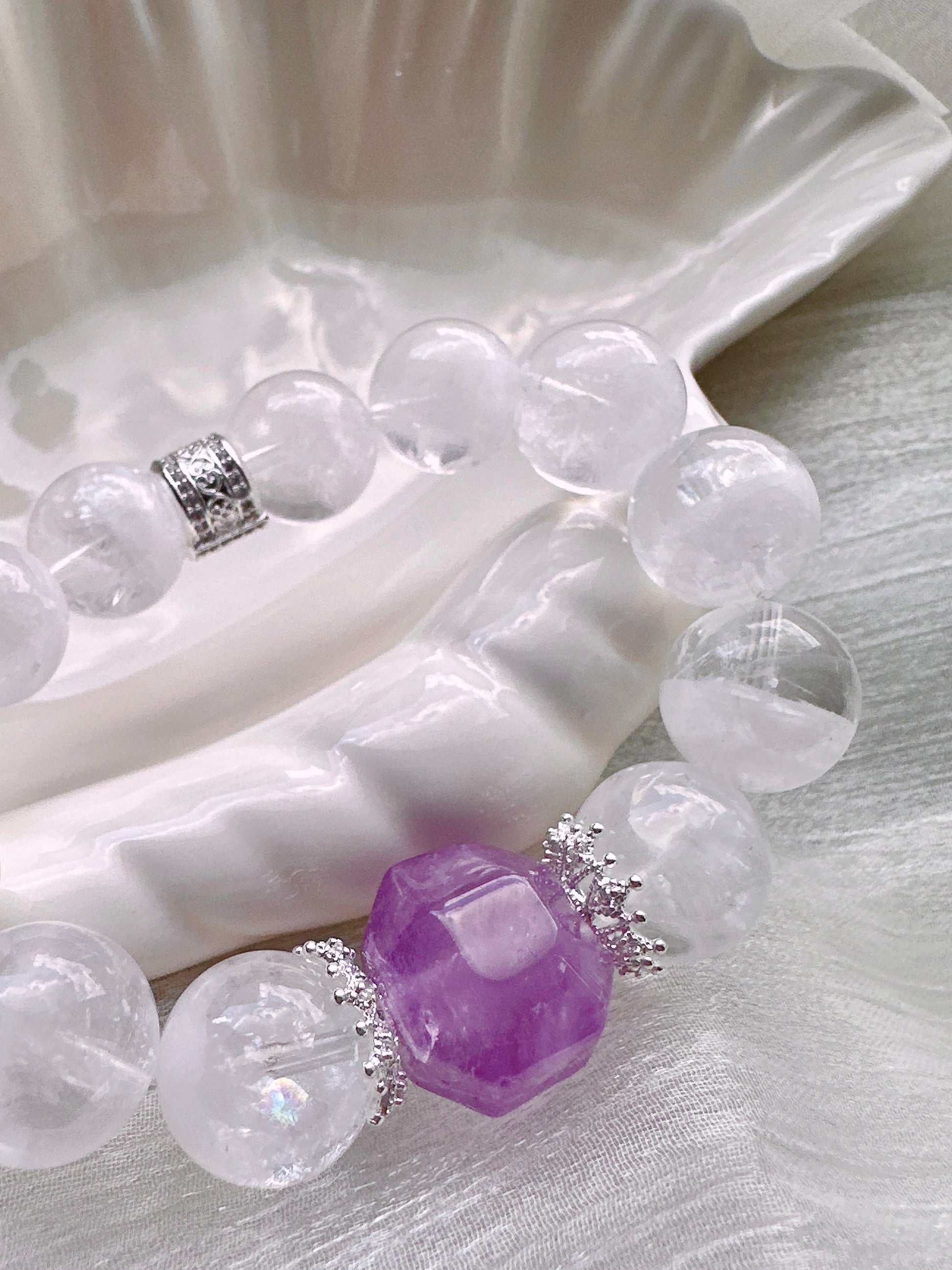 A bracelet that holds the mystery of twilight and the purity of inner stillness. Made with a faceted Amethyst (Water/Fire) centerpiece, surrounded by 12 Phantom Quartz (Metal/Earth) — blending intuition and clarity, grounding and five-element harmony.