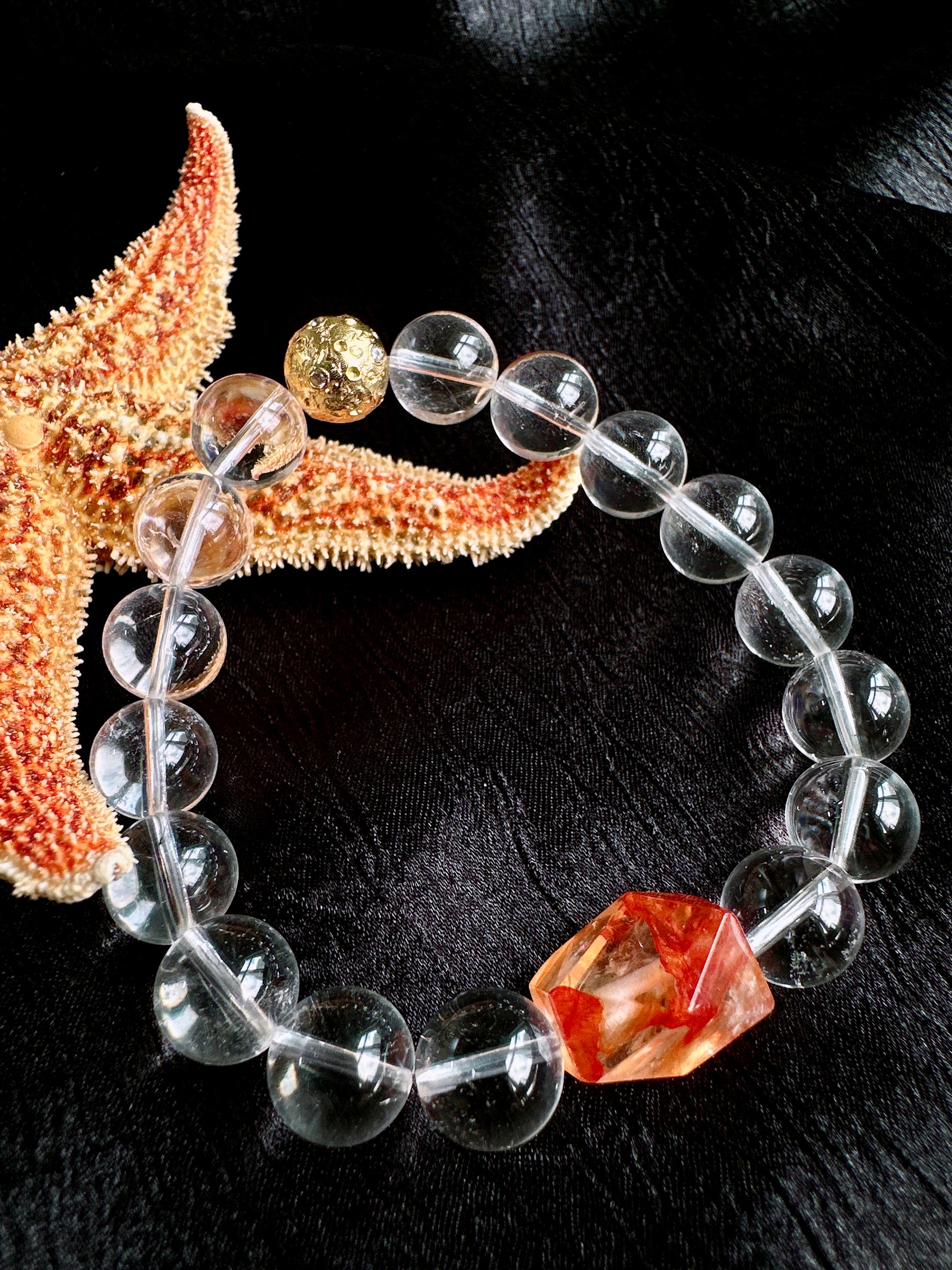 A bracelet that shines with fiery passion and serene clarity. Featuring a faceted Red Glaucus Crystal as the centerpiece, paired with Double-A Grade Clear Quartz, this piece balances vibrant energy with calm purity—igniting your inner spark while keeping you grounded.