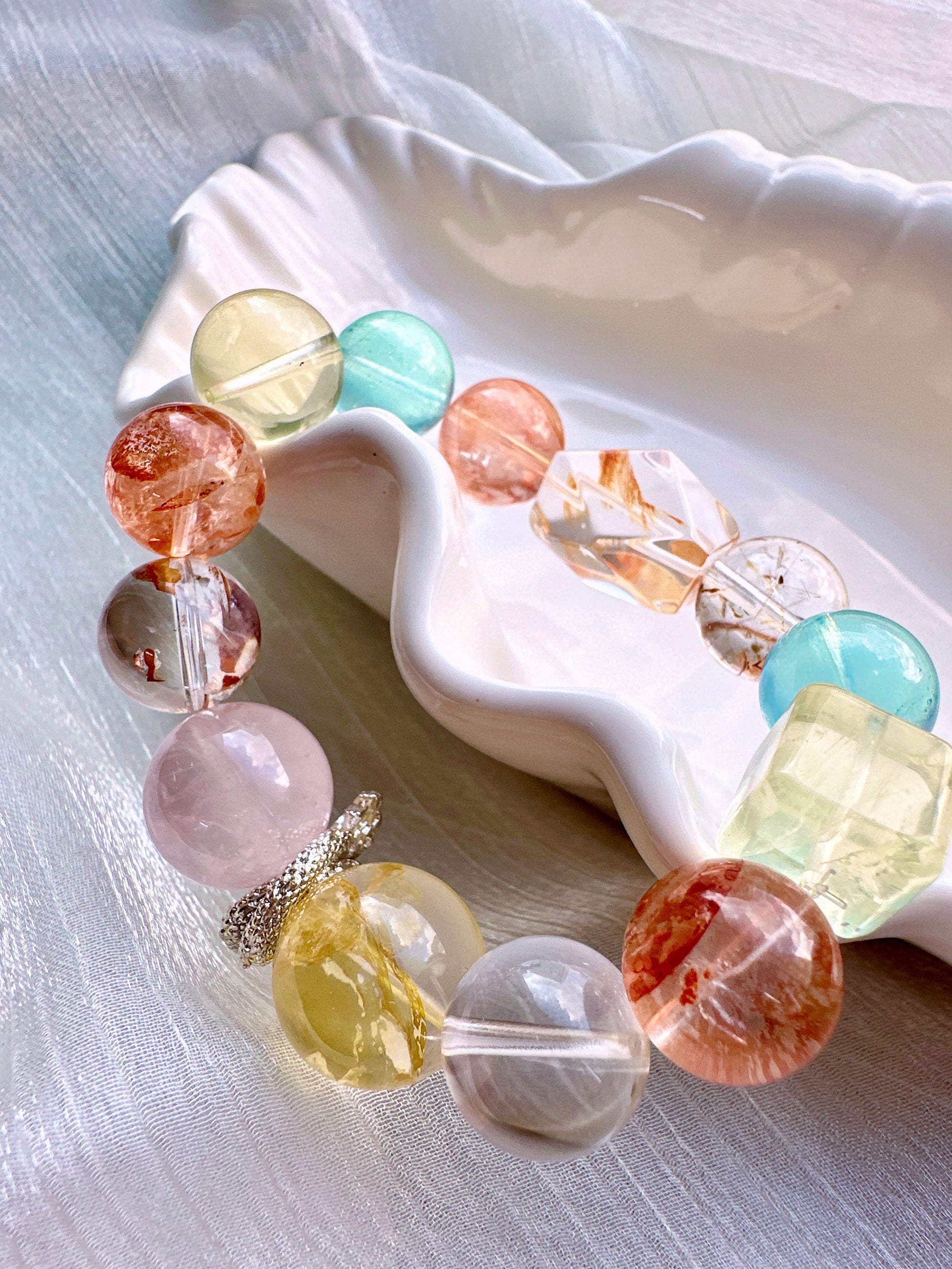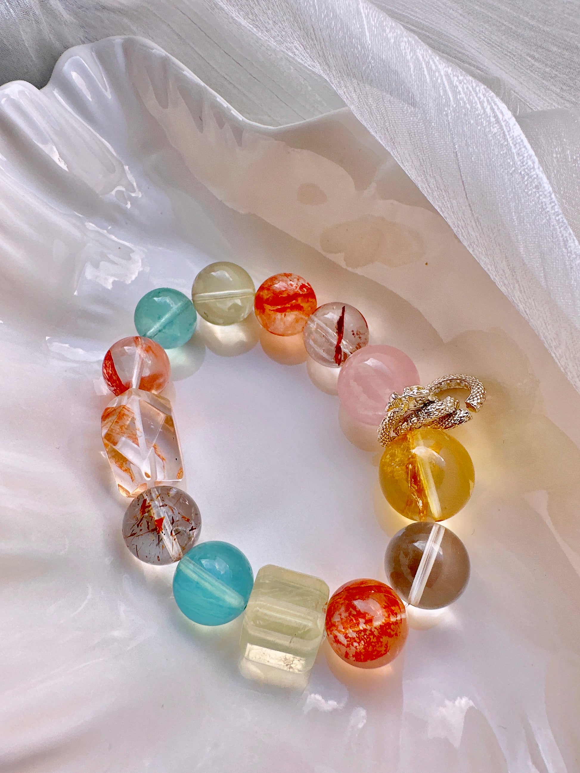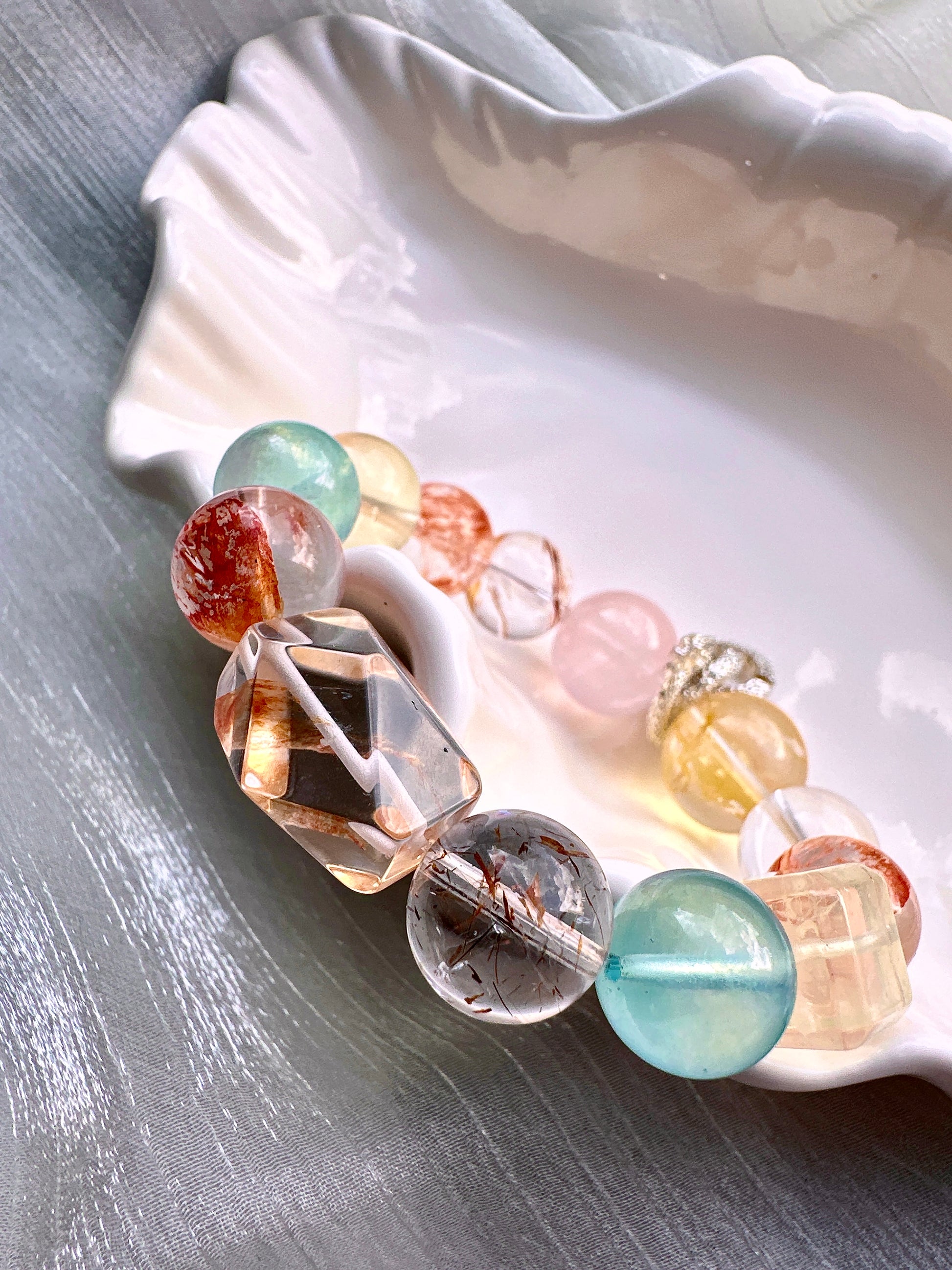 Made with Yellow Jade Flower (Metal), Pink Quartz (Fire), Black Gold Super (Fire/Metal), Red Jade Flower (Fire), Lemon Crystal (Metal), Aquamarine (Water), Clear Quartz (Metal) — bringing together your dreams and Wu Xing energy.