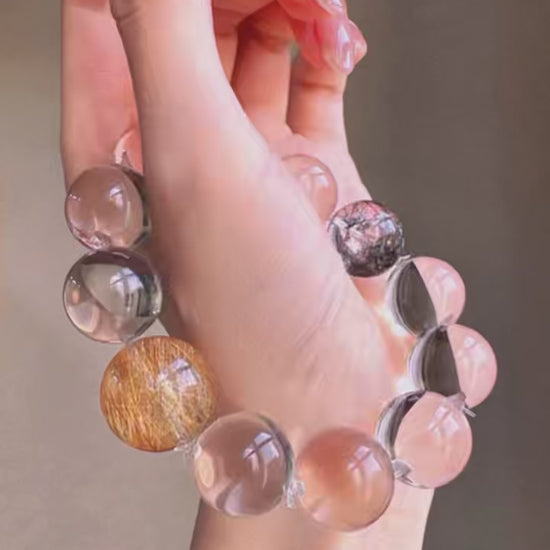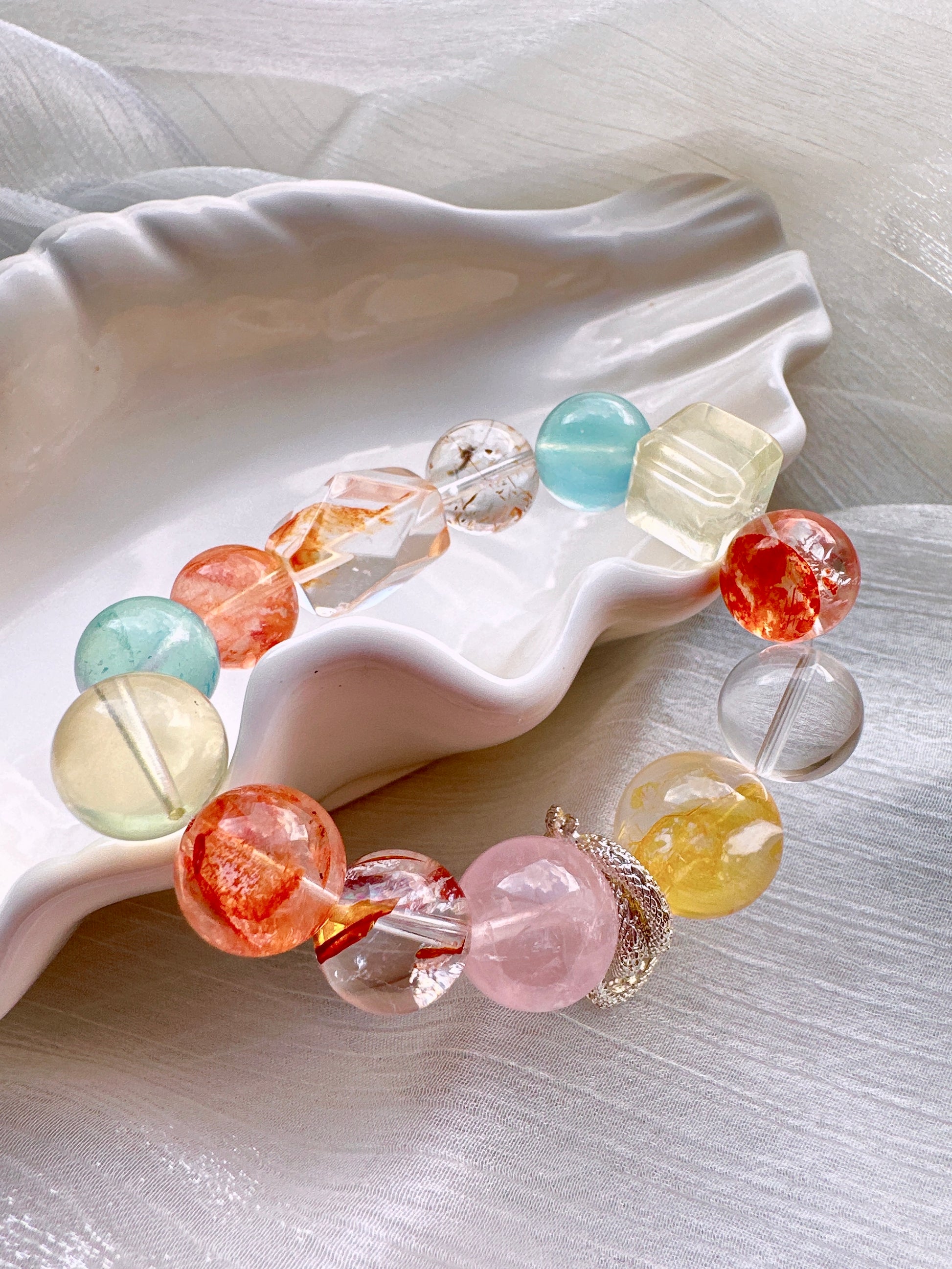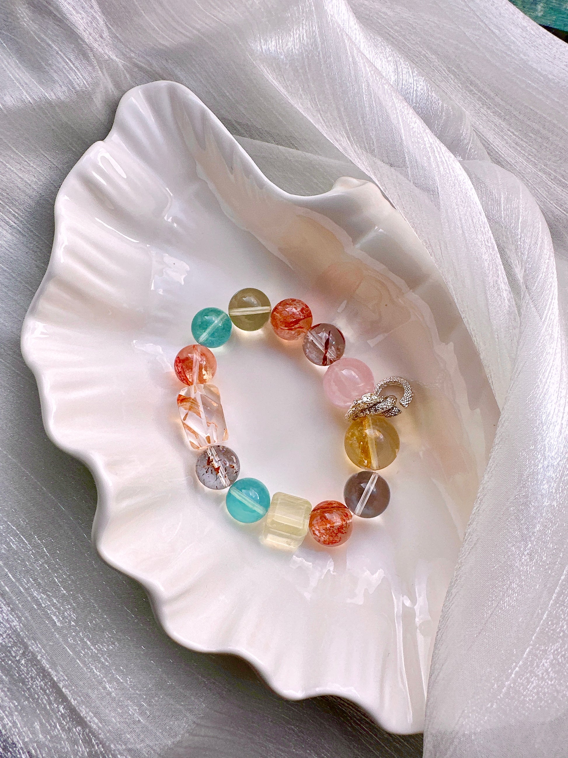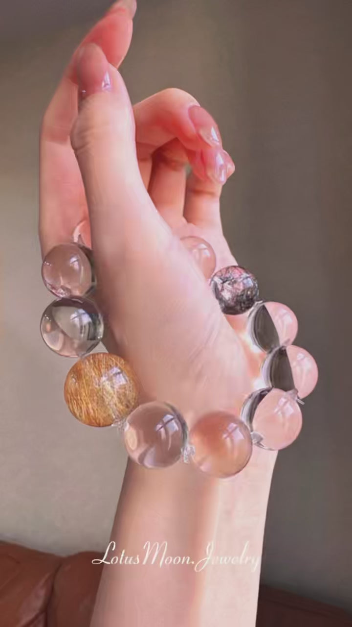 Made with Yellow Jade Flower (Metal), Pink Quartz (Fire), Black Gold Super (Fire/Metal), Red Jade Flower (Fire), Lemon Crystal (Metal), Aquamarine (Water), Clear Quartz (Metal) — bringing together your dreams and Wu Xing energy.